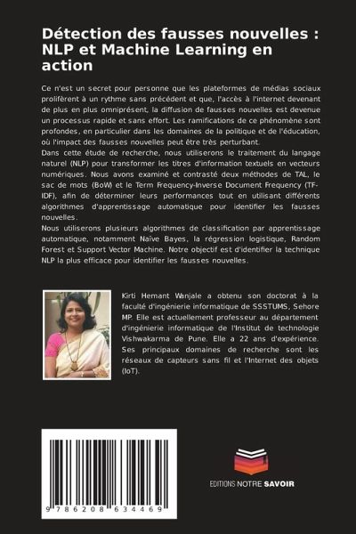 Ce n'est un secret pour personne que les plateformes de médias sociaux prolifèrent à un rythme sans précédent et que, l'accès à l'internet devenant de plus en plus omniprésent, la diffusion de fausses nouvelles est devenue un processus rapide et sans effort. Les ramifications de ce phénomène sont profondes, en particulier dans les domaines de la politique et de l'éducation, où l'impact des fausses nouvelles peut être très perturbant.Dans cette étude de recherche, nous utiliserons le traitement du langage naturel (NLP) pour transformer les titres d'information textuels en vecteurs numériques. Nous avons examiné et contrasté deux méthodes de TAL, le sac de mots (BoW) et le Term Frequency-Inverse Document Frequency (TF-IDF), afin de déterminer leurs performances tout en utilisant différents algorithmes d'apprentissage automatique pour identifier les fausses nouvelles.Nous utiliserons plusieurs algorithmes de classification par apprentissage automatique, notamment Naïve Bayes, la régression logistique, Random Forest et Support Vector Machine. Notre objectif est d'identifier la technique NLP la plus efficace pour identifier les fausses nouvelles.