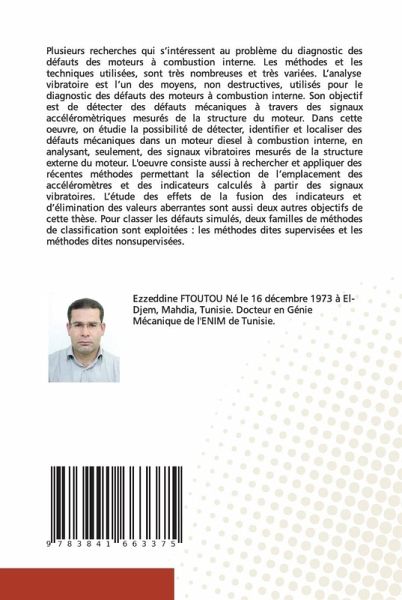 Plusieurs recherches qui s'intéressent au problème du diagnostic des défauts des moteurs à combustion interne. Les méthodes et les techniques utilisées, sont très nombreuses et très variées. L'analyse vibratoire est l'un des moyens, non destructives, utilisés pour le diagnostic des défauts des moteurs à combustion interne. Son objectif est de détecter des défauts mécaniques à travers des signaux accéléromètriques mesurés de la structure du moteur. Dans cette oeuvre, on étudie la possibilité de détecter, identifier et localiser des défauts mécaniques dans un moteur diesel à combustion interne, en analysant, seulement, des signaux vibratoires mesurés de la structure externe du moteur. L'oeuvre consiste aussi à rechercher et appliquer des récentes méthodes permettant la sélection de l'emplacement des accéléromètres et des indicateurs calculés à partir des signaux vibratoires. L'étude des effets de la fusion des indicateurs et d'élimination des valeurs aberrantes sont aussi deux autres objectifs de cette thèse. Pour classer les défauts simulés, deux familles de méthodes de classification sont exploitées : les méthodes dites supervisées et les méthodes dites nonsupervisées.