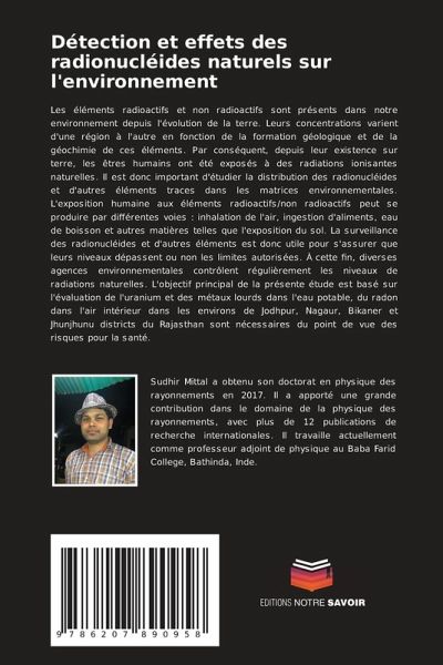 Les éléments radioactifs et non radioactifs sont présents dans notre environnement depuis l'évolution de la terre. Leurs concentrations varient d'une région à l'autre en fonction de la formation géologique et de la géochimie de ces éléments. Par conséquent, depuis leur existence sur terre, les êtres humains ont été exposés à des radiations ionisantes naturelles. Il est donc important d'étudier la distribution des radionucléides et d'autres éléments traces dans les matrices environnementales. L'exposition humaine aux éléments radioactifs/non radioactifs peut se produire par différentes voies : inhalation de l'air, ingestion d'aliments, eau de boisson et autres matières telles que l'exposition du sol. La surveillance des radionucléides et d'autres éléments est donc utile pour s'assurer que leurs niveaux dépassent ou non les limites autorisées. À cette fin, diverses agences environnementales contrôlent régulièrement les niveaux de radiations naturelles. L'objectif principal de la présente étude est basé sur l'évaluation de l'uranium et des métaux lourds dans l'eau potable, du radon dans l'air intérieur dans les environs de Jodhpur, Nagaur, Bikaner et Jhunjhunu districts du Rajasthan sont nécessaires du point de vue des risques pour la santé.