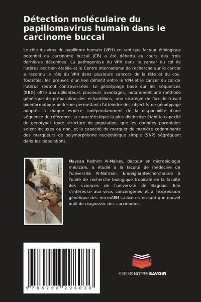 Le rôle du virus du papillome humain (VPH) en tant que facteur étiologique potentiel du carcinome buccal (CB) a été débattu au cours des trois dernières décennies. La pathogenèse du VPH dans le cancer du col de l'utérus est bien établie et le Centre international de recherche sur le cancer a reconnu le rôle du VPH dans plusieurs cancers de la tête et du cou. Toutefois, les preuves d'un lien définitif entre le VPH et le cancer du col de l'utérus restent controversées. Le génotypage basé sur les séquences (SBG) offre aux utilisateurs plusieurs avantages, notamment une méthode générique de préparation des échantillons, une stratégie de flux de travail bioinformatique uniforme permettant d'atteindre des objectifs de génotypage adaptés à chaque espèce, indépendamment de la disponibilité d'une séquence de référence, la caractéristique la plus distinctive étant la capacité de génotyper toute structure de population, que les données parentales soient incluses ou non, et la capacité de marquer de manière codominante des marqueurs de polymorphisme nucléotidique simple (SNP) ségréguant dans les populations.