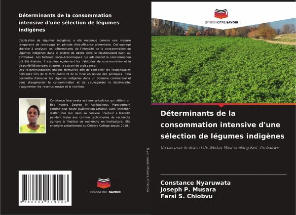 L'utilisation de légumes indigènes a été reconnue comme une mesure temporaire de rattrapage en période d'insuffisance alimentaire. Cet ouvrage cherche à analyser les déterminants de l'intensité de la consommation de légumes indigènes dans le district de Wedza dans le Mashonaland East, au Zimbabwe. Les facteurs socio-économiques qui influencent la consommation ont été évalués. Il examine également les habitudes de consommation et la disponibilité pendant et après la saison de croissance.Des recommandations ont été formulées afin de conseiller les responsables politiques lors de la formulation et de la mise en oeuvre des politiques. Cela permettra d'amener les légumes indigènes dans un domaine commercial et donc d'augmenter la consommation et de sauvegarder la biodiversité, d'augmenter les revenus ruraux et la nutrition.