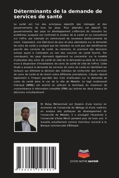 La santé est l'un des principaux objectifs des ménages et des gouvernements de tous les pays. Pour atteindre cet objectif, les gouvernements des pays en développement s'efforcent de résoudre les problèmes auxquels est confronté le secteur de la santé en se concentrant sur l'offre, par exemple en construisant de nouveaux établissements de soins. Cependant, une littérature de plus en plus abondante sur la demande de soins de santé a souligné que les individus ne sont pas des bénéficiaires passifs des services de santé. Au contraire, ils prennent des décisions actives quant à l'utilisation ou non des services de santé fournis. Par conséquent, les pays devraient également se concentrer sur le modèle d'utilisation des soins de santé (le côté de la demande) au-delà de la simple mise à disposition d'installations de soins de santé (le côté de l'offre). Cette étude a analysé la demande de services de soins de santé en identifiant les facteurs qui affectent la décision des individus de rechercher des services de soins de santé et de choisir entre différents prestataires. L'étude répond également à l'impact possible des frais d'utilisation sur la demande de soins de santé dans le cas de la ville de Mekelle. Le logit multinomial imbriqué (NMNL) est estimé en utilisant la technique du maximum de vraisemblance à information complète (FIML) qui estime les deux niveaux de décisions simultanément.