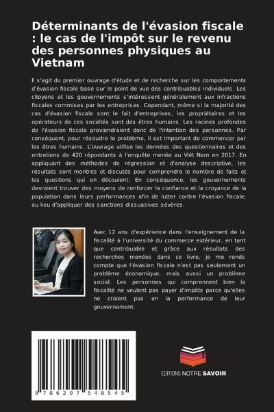 Il s'agit du premier ouvrage d'étude et de recherche sur les comportements d'évasion fiscale basé sur le point de vue des contribuables individuels. Les citoyens et les gouvernements s'intéressent généralement aux infractions fiscales commises par les entreprises. Cependant, même si la majorité des cas d'évasion fiscale sont le fait d'entreprises, les propriétaires et les opérateurs de ces sociétés sont des êtres humains. Les racines profondes de l'évasion fiscale proviendraient donc de l'intention des personnes. Par conséquent, pour résoudre le problème, il est important de commencer par les êtres humains. L'ouvrage utilise les données des questionnaires et des entretiens de 420 répondants à l'enquête menée au Viêt Nam en 2017. En appliquant des méthodes de régression et d'analyse descriptive, les résultats sont montrés et discutés pour comprendre le nombre de faits et les questions qui en découlent. En conséquence, les gouvernements devraient trouver des moyens de renforcer la confiance et la croyance de la population dans leurs performances afin de lutter contre l'évasion fiscale, au lieu d'appliquer des sanctions dissuasives sévères.