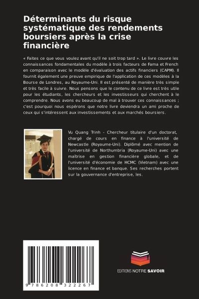 « Faites ce que vous voulez avant qu'il ne soit trop tard ». Le livre couvre les connaissances fondamentales du modèle à trois facteurs de Fama et French en comparaison avec le modèle d'évaluation des actifs financiers (CAPM). Il fournit également une preuve empirique de l'application de ces modèles à la Bourse de Londres, au Royaume-Uni. Il est présenté de manière très simple et très facile à suivre. Nous pensons que le contenu de ce livre est très utile pour les étudiants, les chercheurs et les investisseurs qui cherchent à le comprendre. Nous avons eu beaucoup de mal à trouver ces connaissances ; c'est pourquoi nous espérons que notre livre deviendra un ami proche de ceux qui s'intéressent aux investissements et aux marchés boursiers.