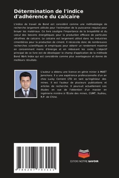 L'indice de travail de Bond est considéré comme une méthodologie de recherche largement utilisée pour l'estimation de la puissance requise pour broyer les matériaux. Ce livre souligne l'importance de la broyabilité et du calcul des besoins énergétiques pour la production efficace de particules ultrafines de calcaire. Le calcaire est largement utilisé dans les industries cimentières pour la production de ciment. Il nécessite donc de nombreuses recherches scientifiques et empiriques pour obtenir un rendement maximal en consommant moins d'énergie et en réduisant les coûts. L'objectif principal de ce livre est de développer le champ d'application de la méthode Bond Work Index qui est considérée comme plus avantageuse et donne de meilleurs résultats.