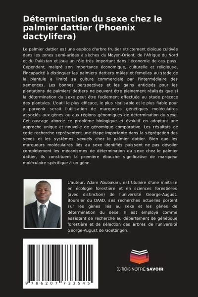 Le palmier dattier est une espèce d'arbre fruitier strictement dioïque cultivée dans les zones semi-arides à sèches du Moyen-Orient, de l'Afrique du Nord et du Pakistan et joue un rôle très important dans l'économie de ces pays. Cependant, malgré son importance économique, culturelle et religieuse, l'incapacité à distinguer les palmiers dattiers mâles et femelles au stade de la plantule a limité sa culture commerciale par l'intermédiaire des semences. Les bonnes perspectives et les gains anticipés pour les plantations de palmiers dattiers ne peuvent être pleinement réalisés que si la détermination du sexe peut être facilement effectuée au stade précoce des plantules. L'outil le plus efficace, le plus réalisable et le plus fiable pour y parvenir serait l'utilisation de marqueurs génétiques moléculaires associés aux gènes ou aux régions génomiques de détermination du sexe. Cet ouvrage aborde ce problème biologique et évolutif en adoptant une approche unique et nouvelle de génomique comparative. Les résultats de cette recherche représentent une étape importante dans la ségrégation des sexes et les systèmes sexuels chez le palmier dattier. Bien que les marqueurs moléculaires liés au sexe identifiés puissent ne pas dévoiler complètement les mécanismes de détermination du sexe chez le palmier dattier, ils constituent la première ébauche significative de marqueur moléculaire spécifique à un gène.