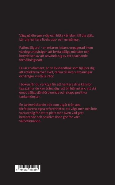 Våga gå din egen väg och hitta kärleken till dig själv. Lär dig hantera livets upp- och nergångar. Fatima Sigurd - en erfaren ledare, engagerad inom värdegrundsfrågor, att bryta dåliga mönster och betydelsen av att använda sig av ett coachande förhållningssätt. Du är en diamant, är en livshandbok som hjälper dig att reflektera över livet, tänka till över utmaningar och frågor vi ställs inför. I boken får du verktyg för att hantera dina känslor, tips på hur du kan träna dig i att bli hjärnstark, att stå emot dåligt självförtroende och skapa positiva tankemönster. En tankeväckande bok som utgår från författarens egna erfarenheter, att våga mer, och inte vara orolig för att ta plats men även vad gott bemötande och positivt sinne gör för vårt välbefinnande.