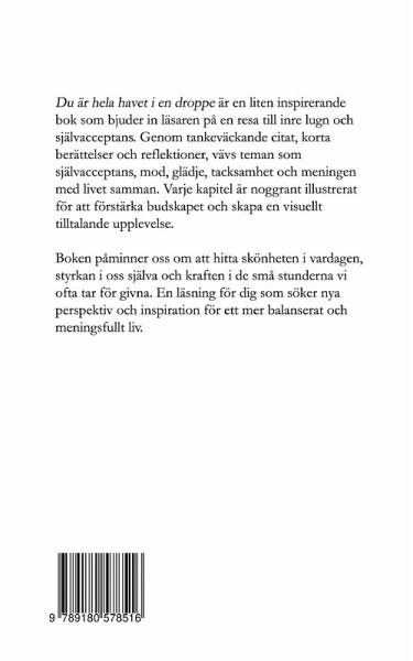 Du är hela havet i en droppe är en inspirerande liten bok som bjuder in läsaren på en resa till inre lugn och självacceptans. Genom tankeväckande citat, korta berättelser och reflektioner vävs teman som självacceptans, mod, glädje, tacksamhet och meningen med livet samman. Varje kapitel är noggrant illustrerat för att förstärka budskapet och skapa en visuellt tilltalande upplevelse. Boken påminner oss om att hitta skönheten i vardagen, styrkan i oss själva och kraften i de små stunderna vi ofta tar för givna. En läsning för dig som söker nya perspektiv och inspiration för ett mer balanserat och meningsfullt liv.