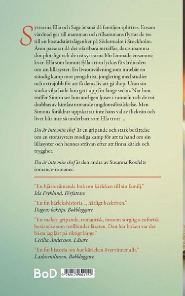 Systrarna Ella och Saga är sju respektive ett år när deras pappa flyttar och familjen splittras. Ensam vårdnad ges till mamman och tillsammans flyttar de tre till en bostadsrättslägenhet på Södermalm i Stockholm. Åren passerar då det ofattbara inträffar, deras mamma dör av en plötslig stroke och de två systrarna blir lämnade ensamma kvar. Vid den tidpunkten har Ella hunnit fylla arton och lyckas därmed få vårdnaden om sin lillasyster. En livsomvälvning som innebär en ständig kamp mot pengabrist och Ella tvingas jonglera med studier och extrajobb för att få deras liv att gå ihop. Om det inte vore för hennes starka vilja hade hon gett upp för länge sedan. När hon via ett extrajobb träffar överklass-killen Simon ser hon äntligen ljuset i tunneln och de två drabbas av himlastormande ungdomsförälskelse. Men Simons föräldrar vill inte acceptera hans val av flickvän och livet blir inte alls så himlastormande som Ella hoppats på ... "Du är inte min chef" är en gripande och stark berättelse om en storasysters ensamma, modiga kamp för att ta hand om sin lillasyster och hennes strävan efter att finna kärlek, trygghet och en familj.