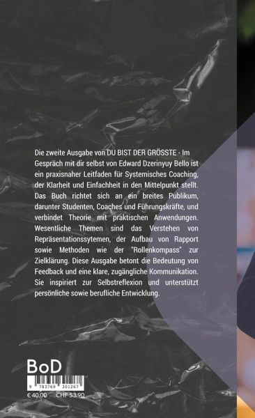 Die zweite Ausgabe von DU BIST DER GRÖSSTE - Im Gespräch mit dir selbst von Edward Dzerinyuy Bello ist ein praxisnaher Leitfaden für Systemisches Coaching, der Klarheit und Einfachheit in den Mittelpunkt stellt. Das Buch richtet sich an ein breites Publikum, darunter Studenten, Coaches und Führungskräfte, und verbindet Theorie mit praktischen Anwendungen. Wesentliche Themen sind das Verstehen von Repräsentationssytemen, der Aufbau von Rapport sowie Methoden wie der "Rollenkompass" zur Zielklärung. Diese Ausgabe betont die Bedeutung von Feedback und eine klare, zugängliche Kommunikation. Sie inspiriert zur Selbstreflexion und unterstützt persönliche sowie berufliche Entwicklung.