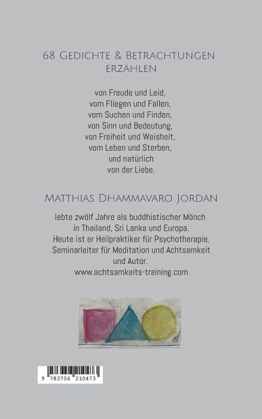 Halte an ... Es begann an einem Nachmittag im Jahr 2020: "Plötzlich kamen diese Worte angeflogen, und ich musste sie aufschreiben", sagt der ehemalige buddhistische Mönch, Matthias Dhammavaro Jordan über die Entstehung dieses Gedichtbandes. (68 Gedichte und Betrachtungen).Eigentlich wissen wir schon alles, aber, wir haben die Tendenz auch wieder schnell zu vergessen. Die LeserInnen werden eingeladen sich erinnern zu lassen, und auf die Themen des Lebens einen neuen, frischen Blick zu werfen. Denn diese Texte berichten von Freude und Leid, vom Fliegen und Fallen, vom Suchen und Finden, von Sinn…mehr