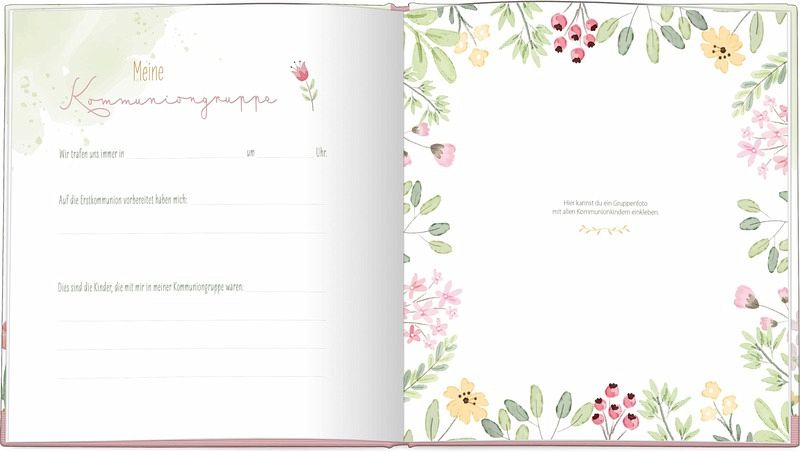 Hochwertiges Erinnerungsalbum zur Erstkommunion Zum Eintragen, Einkleben und Erinnern Zauberhafte Illustrationen mit Blumenmotiven Edel ausgestattet mit goldener Folienveredelung auf dem Cover