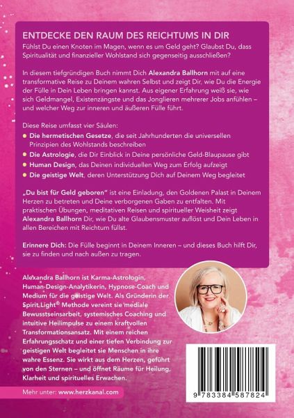 Entdecke den Raum des Reichtums in DirFühlst Du einen Knoten im Magen, wenn es um Geld geht? Glaubst Du, dass Spiritualität und finanzieller Wohlstand sich gegenseitig ausschließen?In diesem tiefgründigen Buch nimmt Dich Alexandra Ballhorn mit auf eine transformative Reise zu Deinem wahren Selbst und zeigt Dir, wie Du die Energie der Fülle in Dein Leben bringen kannst. Aus eigener Erfahrung weiß sie, wie sich Geldmangel, Existenzängste und das Jonglieren mehrerer Jobs anfühlen - und welcher Weg zur inneren und äußeren Fülle führt.Diese Reise umfasst vier Säulen:- Die hermetischen Gesetze, die seit Jahrhunderten die universellen Prinzipien des Wohlstands beschreiben- Die Astrologie, die Dir Einblick in Deine persönliche Geld-Blaupause gibt- Human Design, das Deinen individuellen Weg zum Erfolg aufzeigt- Die geistige Welt, deren Unterstützung Dich auf Deinem Weg begleitet"Du bist für Geld geboren" ist eine Einladung, den Goldenen Palast in Deinem Herzen zu betreten und Deine verborgenen Gaben zu entfalten. Mit praktischen Übungen, meditativen Reisen und spiritueller Weisheit zeigt Alexandra Ballhorn Dir, wie Du alte Glaubensmuster auflöst und Dein Leben in allen Bereichen mit Reichtum füllst.Erinnere Dich: Die Fülle beginnt in Deinem Inneren - und dieses Buch hilft Dir, sie zu finden und nach außen zu tragen.
