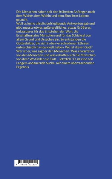 Die Menschen haben seit den frühesten Anfängen nach dem Woher, dem Wohin und dem Sinn ihres Lebens gesucht. Weil es keine allseits befriedigende Antworten gab und gibt, musste etwas außerweltliches, etwas Größeres, unfassbares für das Entstehen der Welt, die Erschaffung des Menschen und für das Schicksal von allem Grund und Ursache sein. So entstanden die Gottesbilder, die sich in den verschiedenen Ethnien unterschiedlich entwickelt haben. Wo ist dieser Gott? Wer ist er, was sagt er den Menschen? Was erwartet er von den Menschen und was erhoffen sich die Menschen von ihm? Wo finden sie Gott - letztlich? Es ist eine seit Langem andauernde Suche, mit einem überraschenden Ergebnis.