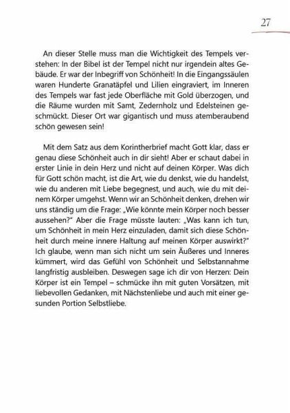 Dieses Buch möchte dir Seite für Seite zeigen: Du bist wertvoll, einzigartig und von Gott geliebt - genau so, wie du bist! Kira Geiss nimmt dich mit auf eine persönliche Reise zu mehr Selbstannahme, Mut und innerer Stärke. Mit ermutigenden Bibelversen, wertvollen Impulsen und interaktiven Videobotschaften christlicher Influencerinnen erfährst du, dass dein Wert nicht von Leistung, Aussehen oder der Meinung anderer abhängt.