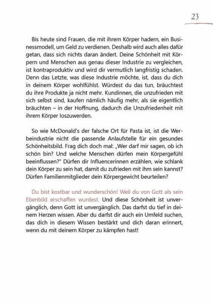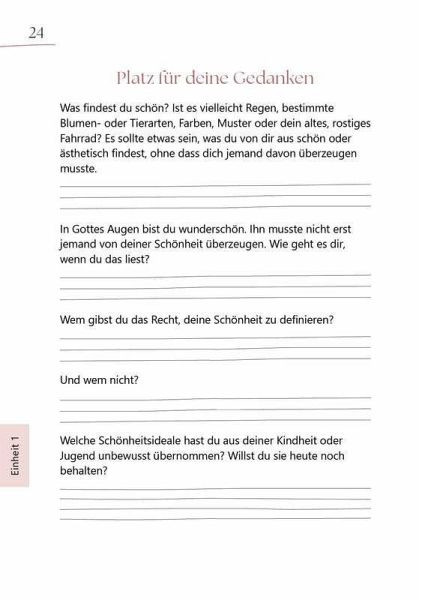Mit Fragen, Denkanstößen und viel Platz für deine eigenen Gedanken wirst du eingeladen, dich selbst besser kennenzulernen, zu reflektieren und deine Identität in Gottes Liebe zu entdecken. Dieses Buch ist dein Mutmachbuch, um dich selbst zu feiern und zu erkennen: Du bist kostbar, du bist geliebt, du bist genug!