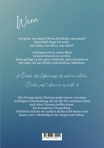 "Du bist viel mehr als deine Gedanken", ist die Fortsetzung einer wahren Geschichte. Theresa ist es nicht nur wichtig, die schlimmen Seiten eines traumatischen Ereignisses zu thematisieren, sondern möchte auch ihren Leserinnen und Lesern den Mut geben, dass es möglich ist, ein Leben zu führen, in dem man positive Erfahrungen sammeln kann. In den unterschiedlichen Fassetten und Momenten ihres Lebens weist die Autorin in gefühlvollem und hautnahem Stil auf, dass es sich immer lohnt weiter zu kämpfen!