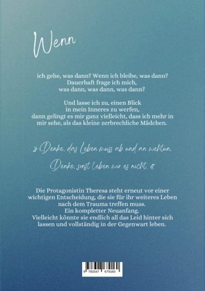 "Du bist viel mehr als deine Gedanken", ist die Fortsetzung einer wahren Geschichte. Theresa ist es nicht nur wichtig, die schlimmen Seiten eines traumatischen Ereignisses zu thematisieren, sondern möchte auch ihren Leserinnen und Lesern den Mut geben, dass es möglich ist, ein Leben zu führen, in dem man positive Erfahrungen sammeln kann. In den unterschiedlichen Fassetten und Momenten ihres Lebens weist die Autorin in gefühlvollem und hautnahem Stil auf, dass es sich immer lohnt weiter zu kämpfen!