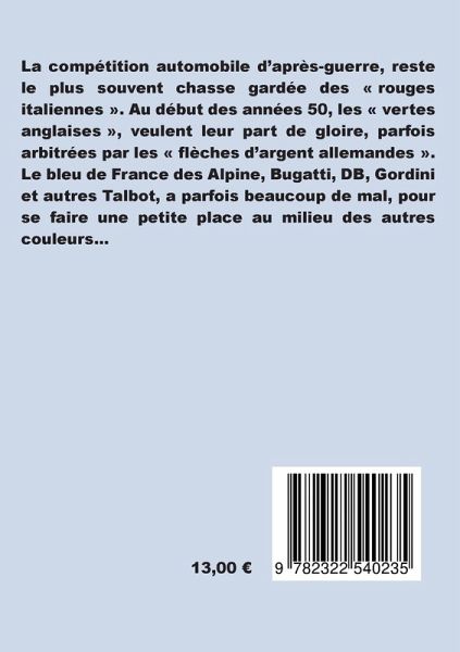 La compétition automobile d'après guerre, reste le plus souvent chasse gardée des "rouges italiennes". Au début des années 50, "les vertes anglaises", veulent leur part de gloire parfois arbitrées par "les flèches d''argent allemandes". Le bleu de France des Alpine, Bugatti, D.B et autres Talbot, a parfois beaucoup de mal pour se faire une petite place au milieu des autres couleurs...