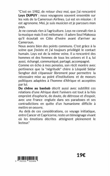 La vie professionnelle de Loys Dupuy, ingénieur agronome, se confond avec celle de l'Aide au Développement."Du chêne au baobab" relate le parcours d'un jeune Pyrénéen ( le chêne symbolise le s Pyrénées), avide d'espaces et d'aventures, depuis son enfance, jusqu'au terme de sa carrière, retraité en Provence, après une vie dédiée aux pays du Sud, entre Cancer et Capricorne : aire du baobab.Voyageant à travers une quinzaine de pays sur chacune des rives de l'Atlantique (dont la Côte d'Ivoire, le Maroc, Cuba, le Sénégal, le Cap-Vert, le Costa-Rica) le lecteur est immergé dans les réalités des sociétés: leur histoire, leur géographie, leur culture, leur environnement précaire où la tradition l'emporte souvent sur la technique.Le récit est illustré d'anecdotes pittoresques ou insolites à travers des témoignages vivants de personnages hauts en couleur mais aussi émaillé de paysages saisissants, caractéristiques des régions tropicales