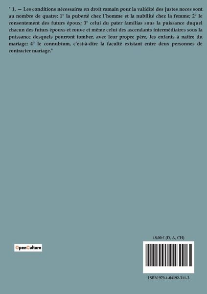 " 1. ¿ Les conditions nécessaires en droit romain pour la validité des justes noces sont au nombre de quatre: 1° la puberté chez l¿homme et la nubilité chez la femme; 2° le consentement des futurs époux; 3° celui du pater familias sous la puissance duquel chacun des futurs épouxs et rouve et même celui des ascendants intermédiaires sous la puissance desquels pourront tomber, avec leur propre père, les enfants à naître du mariage; 4° le connubium, c¿est-à-dire la faculté existant entre deux personnes de contracter mariage."