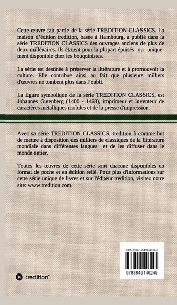 Cette uvre (édition relié) fait partie de la série TREDITION CLASSICS. La maison d édition tredition, basée à Hambourg, a publié dans la série TREDITION CLASSICS des ouvrages anciens de plus de deux millénaires. Ils étaient pour la plupart épuisés ou uniquement disponible chez les bouquinistes. La série est destinée à préserver la littérature et à promouvoir la culture. Avec sa série TREDITION CLASSICS, tredition à comme but de mettre à disposition des milliers de classiques de la littérature mondiale dans différentes langues et de les diffuser dans le monde entier.