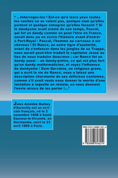 " ...Interrogez-les ! Est-ce qu'à leurs yeux toutes les vanités ne se valent pas, quelque nom qu'elles portent et quelque simagrée qu'elles fassent ? Si le dandysme avait existé de son temps, Pascal, qui fut un dandy comme on peut l'être en France, aurait donc pu en écrire l'histoire avant d'entrer à Port-Royal : Pascal, l'homme au carrosse à six chevaux ! Et Rancé, un autre tigre d'austérité, avant de s'enfoncer dans les jungles de sa Trappe, nous aurait peut-être traduit le capitaine Jesse au lieu de nous traduire Anacréon ; car Rancé fut un dandy aussi ¿ un dandy-prêtre, ce qui est plus fort qu'un dandy mathématicien, et voyez l'influence du dandysme ! Dom Gervaise, un religieux grave, qui a écrit la vie de Rancé, nous a laissé une description charmante de ses délicieux costumes, comme s'il avait voulu nous donner le mérite d'une tentation à laquelle on résiste, en nous donnant l'envie atroce de les porter !..."