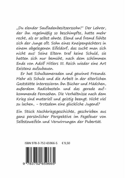 Der Lehrer beschimpfte ihn regelmäßig als elenden Sohn eines Kneipenbesitzers. Er hatte mehr recht, als er selbst ahnte. Elend und fremd fühlte sich der Junge oft. Sohn eines Gastwirts in einem abgelegenen Eifeldorf, das sucht man sich nicht aus! Seine Eltern traf keine Schuld, sie hatten sich nur bemüht, nach dem schlimmen Ende von Adolf Hitlers III. Reich wieder eine Art Existenz aufzubauen.Er hat Schulkameraden und gewinnt Freunde. Mehr als Schule und Arbeit in der elterlichen Gaststätte interessieren ihn Bücher und Mädchen, außerdem Radiobasteln und das gerade aufkommende Fernsehen. Die Verhältnisse nach dem Krieg sind materiell und geistig beengt. Nicht viel zu lachen, - trotzdem eine glückliche Jugend?Ein Stück Nachkriegsgeschichte, geschrieben aus ganz persönlicher Perspektive im Fegefeuer von Selbstzweifeln und Verwirrungen der Pubertät.