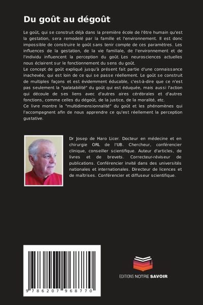 Le goût, qui se construit déjà dans la première école de l'être humain qu'est la gestation, sera remodelé par la famille et l'environnement. Il est donc impossible de construire le goût sans tenir compte de ces paramètres. Les influences de la gestation, de la vie familiale, de l'environnement et de l'individu influencent la perception du goût. Les neurosciences actuelles nous éclairent sur le fonctionnement du sens du goût.Le concept de goût expliqué jusqu'à présent fait partie d'une connaissance inachevée, qui est loin de ce qui se passe réellement. Le goût se construit de multiples façons et est évidemment éducable, c'est-à-dire que ce n'est pas seulement la "palatabilité" du goût qui est éduquée, mais aussi l'action qui découle de ses liens avec d'autres aires cérébrales et d'autres fonctions, comme celles du dégoût, de la justice, de la moralité, etc.Ce livre montre la "multidimensionnalité" du goût et les phénomènes qui l'accompagnent afin de nous apprendre ce qu'est réellement la perception gustative.