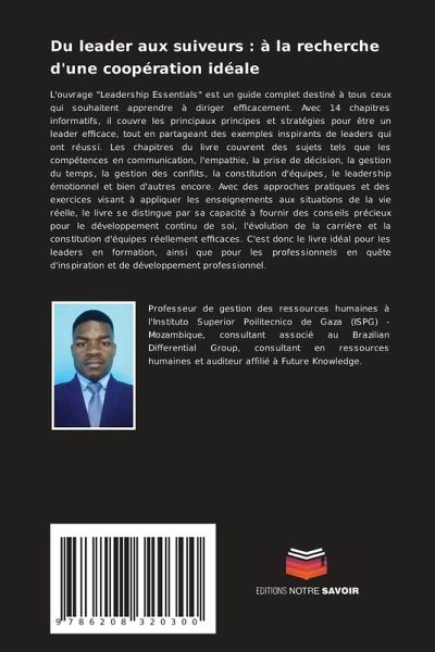 L'ouvrage "Leadership Essentials" est un guide complet destiné à tous ceux qui souhaitent apprendre à diriger efficacement. Avec 14 chapitres informatifs, il couvre les principaux principes et stratégies pour être un leader efficace, tout en partageant des exemples inspirants de leaders qui ont réussi. Les chapitres du livre couvrent des sujets tels que les compétences en communication, l'empathie, la prise de décision, la gestion du temps, la gestion des conflits, la constitution d'équipes, le leadership émotionnel et bien d'autres encore. Avec des approches pratiques et des exercices visant à appliquer les enseignements aux situations de la vie réelle, le livre se distingue par sa capacité à fournir des conseils précieux pour le développement continu de soi, l'évolution de la carrière et la constitution d'équipes réellement efficaces. C'est donc le livre idéal pour les leaders en formation, ainsi que pour les professionnels en quête d'inspiration et de développement professionnel.