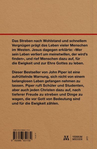 Das Streben nach Wohlstand und schnellem Vergnügen prägt das Leben vieler Menschen im Westen. Jesus dagegen erklärte: 'Wer sein Leben verliert um meinetwillen, der wird's finden', und rief Menschen dazu auf, für die Ewigkeit und zur Ehre Gottes zu leben. Dieser Bestseller von John Piper ist eine aufrüttelnde Warnung, sich nicht von einem belanglosen Leben gefangen nehmen zu lassen. Piper ruft Schüler und Studenten, aber auch jeden Christen dazu auf, nach tieferer Freude zu streben und Dinge zu wagen, die vor Gott von Bedeutung sind und für die Ewigkeit zählen. ¿ Neuauflage des Bestsellers von John Piper ¿ Weckruf für Christen im kulturellen Westen ¿ Geeignetes Geschenk für Schulabsolventen und Studenten