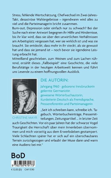 Stress, fehlende Wertschätzung, Chefwechsel im Zwei-Jahres-Takt, desaströse Wahlergebnisse - irgendwann wird alles zu viel und die Parteimanagerin bricht zusammen. Burn-out, Depression oder einfach nur zu schwach? Bei der Suche nach einer Antwort begegnen ihr Hilfe und Hindernisse, bis ihr klar wird, dass sie über den unwirtlichen Verhältnissen am Arbeitsplatz vergessen hat, wer sie wirklich ist und was sie braucht. Sie entdeckt, dass mehr in ihr steckt, als sie gewusst hat und dass sie jemand ist - noch bevor sie irgendeine Leistung erbracht hat.Mitreißend geschrieben, zum Weinen und zum Lachen rührend, erzählt dieses "Fallbeispiel" eine Geschichte, die viele Berufstätige in der heutigen Arbeitswelt kennen und führt uns Lesende zu einem hoffnungsvollen Ausblick.