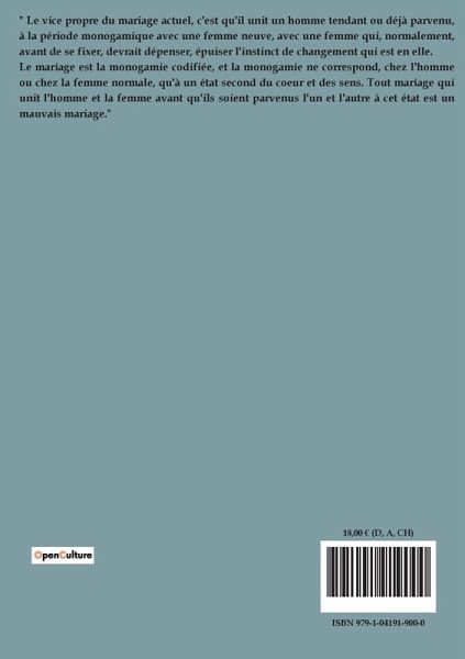 " Le vice propre du mariage actuel, c'est qu'il unit un homme tendant ou déjà parvenu, à la période monogamique avec une femme neuve, avec une femme qui, normalement, avant de se fixer, devrait dépenser, épuiser l'instinct de changement qui est en elle. Le mariage est la monogamie codifiée, et la monogamie ne correspond, chez l'homme ou chez la femme normale, qu'à un état second du coeur et des sens. Tout mariage qui unit l'homme et la femme avant qu'ils soient parvenus l'un et l'autre à cet état est un mauvais mariage."