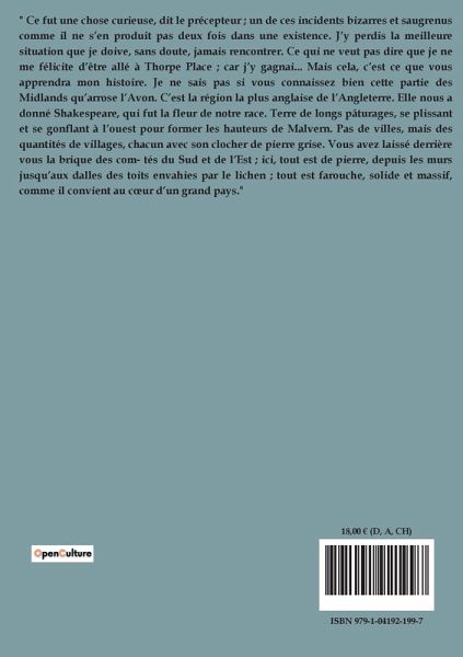 " Ce fut une chose curieuse, dit le précepteur ; un de ces incidents bizarres et saugrenus comme il ne s¿en produit pas deux fois dans une existence. J¿y perdis la meilleure situation que je doive, sans doute, jamais rencontrer. Ce qui ne veut pas dire que je ne me félicite d¿être allé à Thorpe Place ; car j¿y gagnai... Mais cela, c¿est ce que vous apprendra mon histoire. Je ne sais pas si vous connaissez bien cette partie des Midlands qüarrose l¿Avon. C¿est la région la plus anglaise de l¿Angleterre. Elle nous a donné Shakespeare, qui fut la fleur de notre race. Terre de longs pâturages, se plissant et se gonflant à l¿ouest pour former les hauteurs de Malvern. Pas de villes, mais des quantités de villages, chacun avec son clocher de pierre grise. Vous avez laissé derrière vous la brique des com- tés du Sud et de l¿Est ; ici, tout est de pierre, depuis les murs jusqüaux dalles des toits envahies par le lichen ; tout est farouche, solide et massif, comme il convient au c¿ur d¿un grand pays."