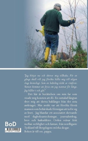 Med prosalyrikens kraft kommer en dotter närmare sin far efter hans bortgång. Texterna är ärliga med en stark närvaro utan sentimentalitet. Det cirkulära berättandet rör sig kring döden som en sorts nav i livet. Verkligheten lyfts till andra dimensioner med fantasins kraft och skapar nya samband över generationer. Det är berättelsen om en far som visade konsten att dö. Ett associativt skrivande varvas med dagboksanteckningar, journalutdrag, brev och haikudikter. Orden svävar fritt från nordligaste Tyskland till Bergslagens mörka skogar.