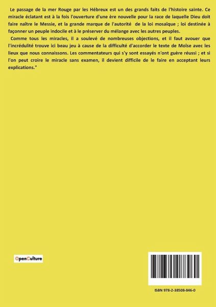 Le passage de la mer Rouge par les Hébreux est un des grands faits de l'histoire sainte. Ce miracle éclatant est à la fois l'ouverture d'une ère nouvelle pour la race de laquelle Dieu doit faire naître le Messie, et la grande marque de l'autorité de la loi mosaïque ; loi destinée à façonner un peuple indocile et à le préserver du mélange avec les autres peuples. Comme tous les miracles, il a soulevé de nombreuses objections, et il faut avouer que l'incrédulité trouve ici beau jeu à cause de la difficulté d'accorder le texte de Moïse avec les lieux que nous connaissons. Les commentateurs qui s'y sont essayés n'ont guère réussi ; et si l'on peut croire le miracle sans examen, il devient difficile de le faire en acceptant leurs explications."