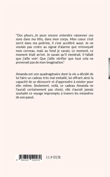"Des pleurs...Je peux encore entendre raisonner ces sons dans ma tête, dans mon corps. Mon coeur s'est serré dans ma poitrine, il s'est accéléré aussi. Je ne voulais pas croire au signal d'alarme que m'envoyait mon cerveau, mais au fond je savais. Le moment, ce moment était arrivé. Je savais qu'il viendrait. Il fallait que j'aille voir! Que j'aille vérifier que tout cela ne provenait pas de mon imagination."Amanda est une quadragénaire dont la vie a décidé de lui faire un cadeau très mal emballé, lui offrant ainsi la capacité de se découvrir et d'apprendre à exister pour elle-même. Seulement, voilà, ce cadeau Amanda ne l'aurait certainement pas choisi, elle n'aurait jamais souhaité ce voyage impromptu à travers les méandres de son passé.
