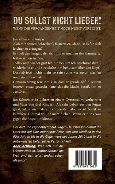 Ein tiefgründiger Roman über die Macht von Erziehung, den Einfluss von Traumata und den schwierigen Weg zur Selbstakzeptanz. "Du sollst nicht lieben!" ist ein mutiger Blick in die Männerseele, der aufwühlt, zum Nachdenken anregt und herausfordert. - Leseprobe - "Jan schloss die Augen. "Gib mir deinen Schrecken", flüsterte er, "dann ist es für dich leichter zu ertragen." Er hielt den Jungen, der sich immer noch an ihn klammerte, fest in seinen Armen. "Alles wird wieder gut! Ich bin bei dir! Ich beschütze dich!", wiederholte er und streichelte ihm behutsam über den Kopf. Dass ab jetzt nichts mehr so sein sollte wie zuvor, war ihm noch nicht bewusst. Genauso wenig war ihm klar, dass er gerade tief in seinem Inneren etwas geweckt hatte, das die Macht besaß, ihn zu zerstören." - Jan Schneider, ein engagierter Lehrer, liebender Familienvater und angesehener Bürger seiner Stadt, wird durch eine Intrige aus seinem geregelten Leben gerissen. Die Anschuldigungen gegen ihn sind ungeheuerlich und drohen, sein gesamtes Dasein zu zerstören. Während er sich mit den Dämonen seiner Vergangenheit auseinandersetzen muss, stößt er immer wieder auf das zentrale Thema des Romans: die Angst vor Liebe. Aufgewachsen unter der strengen Moralvorstellung seiner Tanten, ringt er mit tief verwurzelten Schamgefühlen und einem Identitätskonflikt, den er kaum in Worte fassen kann. Als er sich einer therapeutischen Ausbildungsgruppe anschließt, beginnt ein intensiver Prozess der Selbstreflexion, der ihn mit verdrängten Erinnerungen, gesellschaftlichen Stigmata und seinen eigenen moralischen Grenzen konfrontiert. Doch sein Weg ist steinig: manipulative Machenschaften und Fotos, die ihn schwer belasten, bringen sein Leben ins Wanken. Wird Jan seine Vergangenheit überwinden und endlich seinen Platz im Leben finden? Ein tiefgründiger psychologischer Roman über Schuld, Verdrängung und die Suche nach Identität. Wenn Sie Werke von Irvin D. Yalom oder Pascal Mercier schätzen, wird Sie dieser Roman fesseln. Der Arzt und Psychotherapeut Jürgen Fleischmann nimmt die Leser mit auf eine spannende Reise, von Jans Kindheit in den 60er Jahren bis in die Gegenwart des Jahres 2010 und in die unbewussten Tiefen seiner Persönlichkeit. Aber Achtung! Wer sich auf die Lektüre einlässt, könnte danach die Welt und sich selbst anders sehen als zuvor!
