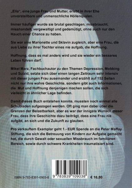 "Ella", eine junge Frau und Mutter, erlebt in ihrer Ehe unvorstellbare und unmenschliche Höllenqualen.Immer häufiger wurde sie brutal geschlagen, missbraucht, misshandelt, vergewaltigt und gedemütigt, ohne auch nur den Hauch einer Chance zu haben.Sie war eine Marionette und Sklavin zugleich, aber eine Frau, die aus Liebe zu ihrer Tochter eines nie aufgab, die Hoffnung.Hoffnung, dass es mal anders wird und sie wieder ein besseres Leben führen darf.Mikel Marz, Fachbuchautor zu den Themen Depression, Mobbing und Suizid, setzte sich über einen langen Zeitraum sehr intensiv mit dieser jungen Frau auseinander und erzählt auf 156 Seiten nicht nur ihre wahre Geschichte, sondern gibt auch Informationen, die Mut und Hoffnung denjenigen machen sollen, die sich vielleicht in ähnlicher Lage befinden.Damit dieses Buch entstehen konnte, mussten noch einmal alle Schubladen aufgezogen werden. Oft ging man dabei über die Grenzen der Belastbarkeit, aber es war der innigste Wunsch dieser Frau, dassihre Geschichte dazu beiträgt, dass eine Frau nie aufgibt, an sich und die Zukunft zu glauben.Pro verkauftem Exemplar, geht 1.- EUR Spende an die Peter Maffay Stiftung, die sich die Betreuung von Kindern zur Aufgabe gemacht hat, die durch Gewalt oder sexuellen Missbrauch im familiären Bereich, sowie durch schwere Krankheiten traumatisiert sind.
