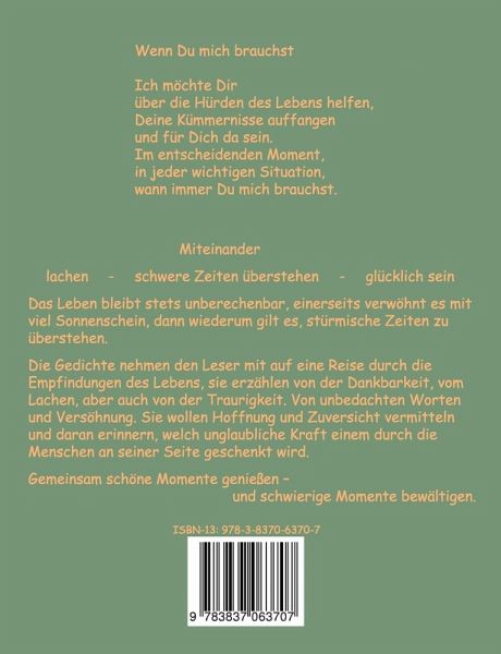 Das Leben bleibt stets unberechenbar, einerseits verwöhnt es mit viel Sonnenschein, dann wiederum gilt es, stürmische Zeiten zu überstehen.Die 35 Gedichte nehmen den Leser mit auf eine Reise durch die Empfindungen des Lebens, sie erzählen von der Dankbarkeit, vom Lachen, aber auch von der Traurigkeit, von unbedachten Worten und Versöhnung. Sie wollen Hoffnung und Zuversicht vermitteln und daran erinnern, welch unglaubliche Kraft einem durch die Menschen an seiner Seite geschenkt wird.Gemeinsam schöne Momente genießen - und schwierige Momente bewältigen.