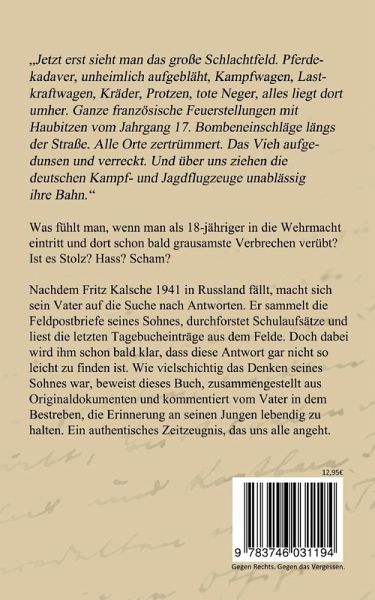 'Jetzt erst sieht man das große Schlachtfeld. Pferdekadaver, unheimlich aufgebläht, Kampfwagen, Lastkraftwagen, Kräder, Protzen, tote Neger, alles liegt dort umher. Ganze französische Feuerstellungen mit Haubitzen vom Jahrgang 17. Bombeneinschläge längs der Straße. Alle Orte zertrümmert. Das Vieh aufgedunsen und verreckt. Und über uns ziehen die deutschen Kampf- und Jagdflugzeuge unablässig ihre Bahn.'Was fühlt man, wenn man als 18-jähriger in die Wehrmacht eintritt und dort schon bald grausamste Verbrechen verübt? Ist es Stolz? Hass? Scham?Nachdem Fritz Kalsche 1941 in Russland fällt, macht sich sein Vater auf die Suche nach Antworten. Er sammelt die Feldpostbriefe seines Sohnes, durchforstet Schulaufsätze und liest die letzten Tagebucheinträge aus dem Felde. Doch dabei wird ihm schon bald klar, dass diese Antwort gar nicht so leicht zu finden ist. Wie vielschichtig das Denken seines Sohnes war, beweist dieses Buch, zusammengestellt aus Originaldokumenten und kommentiert vom Vater in dem Bestreben, die Erinnerung an seinen Jungen lebendig zu halten. Ein authentisches Zeitzeugnis, das uns alle angeht.