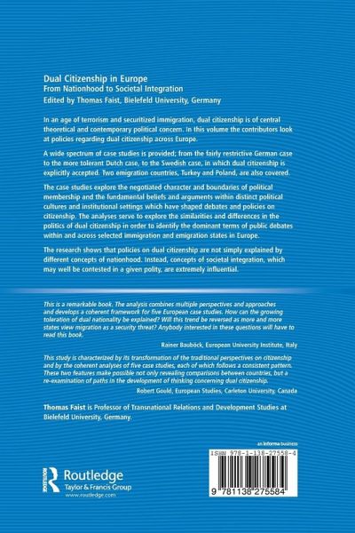 In an age of terrorism and securitized immigration, dual citizenship is of central concern. The contributors to this timely volume examine policies regarding dual citizenship across Europe, covering a wide spectrum of countries. The case studies explore the negotiated character and boundaries of political membership and the fundamental beliefs and arguments which have shaped debates and policies on citizenship.