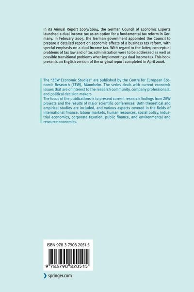 In its Annual Report 2003/2004, the German Council of Economic Experts launched a dual income tax as an option for a fundamental tax reform in Germany. In February 2005, the German government appointed the Council to prepare a detailed report on economic effects of a business tax reform, with special emphasis on a dual income tax. With regard to the latter, conceptual problems of tax law and of tax administration were to be addressed as well as possible transitional problems when implementing a dual income tax. This book presents an English version of the original report completed in April 2006.