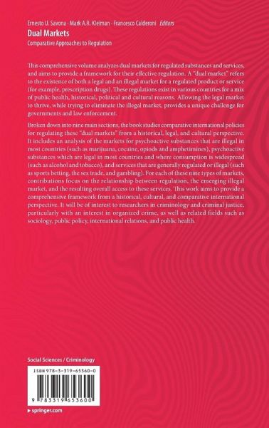 This comprehensive volume analyzes dual markets for regulated substances and services, and aims to provide a framework for their effective regulation. A "dual market" refers to the existence of both a legal and an illegal market for a regulated product or service (for example, prescription drugs). These regulations exist in various countries for a mix of public health, historical, political and cultural reasons. Allowing the legal market to thrive, while trying to eliminate the illegal market, provides a unique challenge for governments and law enforcement. Broken down into nine main sections, the book studies comparative international policies for regulating these "dual markets" from a historical, legal, and cultural perspective. It includes an analysis of the markets for psychoactive substances that are illegal in most countries (such as marijuana, cocaine, opiods and amphetimines), psychoactive substances which are legal in most countries and where consumption is widespread(such as alcohol and tobacco), and services that are generally regulated or illegal (such as sports betting, the sex trade, and gambling). For each of these nine types of markets, contributions focus on the relationship between regulation, the emerging illegal market, and the resulting overall access to these services.