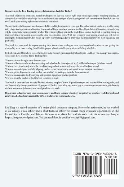 Get Access to the Best Trading Strategy Information Available Today! This book offers you a simple and reliable trading system that you can use right away with no guessing or tweaking required. It comes with a trend filter that helps you to understand the strength of the existing trend, and a momentum filter that you can tweak to fit your own trading style and to increase its robustness. The mechanics of this system were first unveiled in a public forum several years ago. The author takes it to the next level by using daily charts as the primary trading time frame and adding a trend and momentum filter. If you follow this system correctly, you will be taking only high probability trades. The system will keep you in the trade for as long as the trend is running strong so that you will not be leaving money on the table by exiting too soon. With this system in your trading arsenal, you will not be making the mistakes most traders made, especially, over-trading and over-analyzing, the main reasons why most traders are not profitable. This book is a must read for anyone starting their journey into trading, or even experienced traders that are not getting the results they want from trading. It is ideal for people who work full time or those with busy schedules. In this book, you'll learn how successful traders make money by consistently trading trends - and how you can copy that success. You'll learn these essential Trend Trading skills: * How to choose the right time frame to trade * How to tell whether the market is trending and whether the existing trend is (a) stable and strong or (b) about to end * How to enter a trade only when the trend is strong and exit a trade only when the trend is about to end * How to maximize your profit by the aligning market cycles, momentum and trends across multiple time frames * How to pick a direction to trade so that you wouldn't be trading against the dominant trend * How to manage risks by diversifying and position sizing your trading portfolio * How to scan the market to find the best securities to trade This book is short and can be easily finished within a couple of hours. It provides simple and easy to follow trading rules, and can dramatically change your financial prospects! For less than what you would pay in commission on one trade, this book to be the best investment (of money and time) you have ever made. If you want to fast-forward your learning curve and learn to trade effectively as quickly as possible, read this book and give yourself a head start against the 90% of traders who consistently lose.