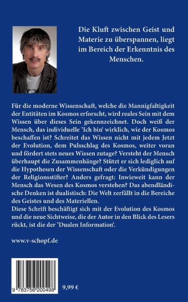 Für die moderne Wissenschaft, welche die Mannigfaltigkeit der Entitäten im Kosmos erforscht, wird reales Sein mit dem Wissen über dieses Sein gekennzeichnet. Doch weiß der Mensch, das individuelle "Ich bin" wirklich, wie der Kosmos beschaffen ist? Schreitet das Wissen nicht mit jedem Jetzt der Evolution, dem Pulsschlag des Kosmos, weiter voran und fördert stets neues Wissen zutage? Versteht der Mensch überhaupt die Zusammenhänge? Stützt er sich lediglich auf die Hypothesen der Wissenschaft oder die Verkündigungen der Religionsstifter? Anders gefragt: Inwieweit kann der Mensch das Wesen des Kosmos verstehen? Das abendländische Denken ist dualistisch: Die Welt zerfällt in die Bereiche des Geistes und des Materiellen.Diese Schrift beschäftigt sich mit der Evolution des Kosmos und die neue Sichtweise, die der Autor in den Blick des Lesers rückt, ist die der "Dualen Information".