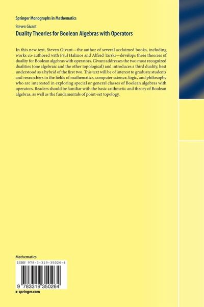 In this new text, Steven Givant-the author of several acclaimed books, including works co-authored with Paul Halmos and Alfred Tarski-develops three theories of duality for Boolean algebras with operators. Givant addresses the two most recognized dualities (one algebraic and the other topological) and introduces a third duality, best understood as a hybrid of the first two. This text will be of interest to graduate students and researchers in the fields of mathematics, computer science, logic, and philosophy who are interested in exploring special or general classes of Boolean algebras with operators. Readers should be familiar with the basic arithmetic and theory of Boolean algebras, as well as the fundamentals of point-set topology.