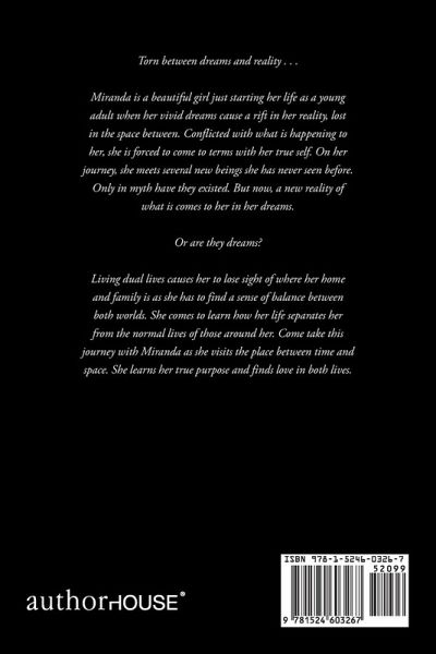 Torn between dreams and reality . . . Miranda is a beautiful girl just starting her life as a young adult when her vivid dreams cause a rift in her reality, lost in the space between. Conflicted with what is happening to her, she is forced to come to terms with her true self. On her journey, she meets several new beings she has never seen before. Only in myth have they existed. But now, a new reality of what is comes to her in her dreams. Or are they dreams? Living dual lives causes her to lose sight of where her home and family is as she has to find a sense of balance between both worlds. She comes to learn how her life separates her from the normal lives of those around her. Come take this journey with Miranda as she visits the place between time and space. She learns her true purpose and finds love in both lives.