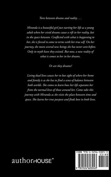 Torn between dreams and reality . . . Miranda is a beautiful girl just starting her life as a young adult when her vivid dreams cause a rift in her reality, lost in the space between. Conflicted with what is happening to her, she is forced to come to terms with her true self. On her journey, she meets several new beings she has never seen before. Only in myth have they existed. But now, a new reality of what is comes to her in her dreams. Or are they dreams? Living dual lives causes her to lose sight of where her home and family is as she has to find a sense of balance between both worlds. She comes to learn how her life separates her from the normal lives of those around her. Come take this journey with Miranda as she visits the place between time and space. She learns her true purpose and finds love in both lives.