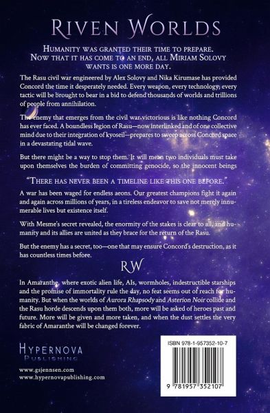 Humanity was granted their time to prepare. Now that it has come to an end, all Miriam Solovy wants is one more day. The Rasu civil war engineered by Alex Solovy and Nika Kirumase has provided Concord the time it desperately needed. Every weapon, every technology, every tactic will be brought to bear in a bid to defend thousands of worlds and trillions of people from annihilation. The enemy that emerges from the civil war victorious is like nothing Concord has ever faced. A boundless legion of Rasu-now interlinked and of one collective mind due to their integration of kyoseil-prepares to sweep across Concord space in a devastating tidal wave. But there might be a way to stop them. It will mean two individuals must take upon themselves the burden of committing genocide, so the innocent beings they protect need never know how such an act comes with a price. "There has never been a timeline like this one before." A war has been waged for endless aeons. Our greatest champions fight it again and again across millions of years, in a tireless endeavor to save not merely innumerable lives but existence itself. With Mesme's secret revealed, the enormity of the stakes is clear to all, and humanity and its allies are united as they brace for the return of the Rasu. But the enemy has a secret, too-one that may ensure Concord's destruction, as it has countless times before. * In Amaranthe, where exotic alien life, AIs, wormholes, indestructible starships and the promise of immortality rule the day, no feat seems out of reach for humanity. But when the worlds of Aurora Rhapsody and Asterion Noir collide and the Rasu horde descends upon them both, more will be asked of heroes past and future. More will be given and more taken, and when the dust settles the very fabric of Amaranthe will be altered forever.